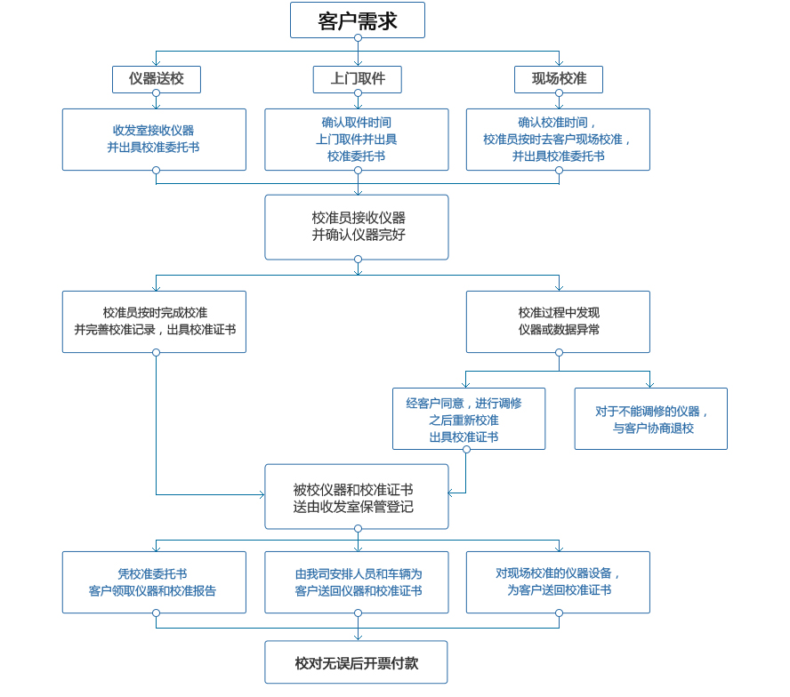 对于可以送校的计量器具一般建议客户送校(可送校通常是指样品在运输过程影响准确度变化较小的,可以搬动的,我司标准器不能外带的,需要等温的和对校准环境要求较高的项目等)。属于需要在现场校准的项目,如果客户要求现场服务,在计量标准装置能够携带、现场环境条件能满足校准要求的前提下,安排校准人员下厂校准,本着为客户着想的原则与客户协商解决。